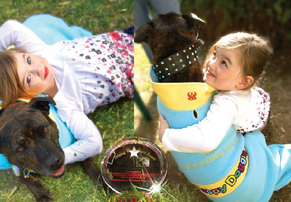 Shining World Hero Award recipient Roary the Staffordshire Bull Terrier is recognized for placing himself in harm’s way to protect his human family.