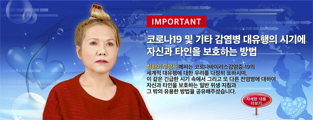 사랑의 길을 걷다사랑은 입으로만 하는 게 아니라 내면의 느낌과 외적 행동으로 나타나야 해요 동물을 사랑한다면 채식인(비건)이 될 거예요 지구를 사랑한다면 환경을 보호할 거예요 세상을 사랑한다면 이 행성을 구할 겁니다 ~ 칭하이 무상사 (비건)더보기살아 있는 성인의 길을 걷다칭하이 무상사 소개예술과 영성칭하이 무상사 소개<진정한 사랑> - 마음을 모으는 뮤지컬칭하이 무상사 소개저서더보기시집Wu Tzu PoemsWu Tzu Poems더보기시집The Love of CenturiesThe Love of Centuries더보기시집The Dream of a ButterflyThe Dream of a Butterfly더보기시집Silent TearsSilent Tears더보기영성Secrets to Effortless Spiritual PracticeSecrets to Effortless Spiritual Practice더보기영성I Have Come to Take You HomeI Have Come to Take You Home더보기영성Coloring Our LivesColoring Our Lives더보기영성Aphorisms 2Aphorisms 2더보기영성Aphorisms 1Aphorisms더보기예술The Real LoveThe Real Love더보기예술Loving the Silent Tears 3Loving the Silent Tears 3더보기예술Loving the Silent Tears 2Loving the Silent Tears 2더보기예술Loving the Silent Tears 1Loving the Silent Tears 1더보기예술Celestial ArtCelestial Art더보기요리Supreme Kitchen 2Supreme Kitchen2더보기요리Supreme Kitchen 1Supreme-Kitchen1더보기기후 변화From Crisis to PeaceAt conferences, in interviews with journalists and at gatherings with disciples in recent years, Supreme Master Ching Hai has spoken with increasing urgency about Earth’s current climate crisis. As she states, “Our planet is a house that is burning. If we don’t work together with a united spirit to …더보기고귀한 동물The Noble WildsThe Noble Wilds더보기고귀한 동물The Dogs in My LifeThe Dogs in My Life더보기고귀한 동물The Birds in My LifeThe Birds in My Life더보기어린이Your Halo is too Tight!Your Halo is too Tight!더보기어린이Master Tells StoriesMaster Tells Stories더보기어린이God Takes Care of EverythingGod Takes Care of Everything더보기기타The Realization of HealthThe Realization of Health더보기시집영성예술요리기후 변화고귀한 동물어린이기타잡지더보기잡지News Magazine No.215이 세상에서는 수행하고 진보하기가 더 쉽습니다 왜냐하면 고통 받는 사람들과 고통 받는 동물들이 존재하고 고통스러운 상황들과 불완전한 상황들이 존재하여 우리의 연민을 건드리고 자비심을 일깨워주니 우리가 이를 끌어내어 발전시킬 수 있고 상황을 개선시키고 남을 도울 수 있기 때문입니다 그게 바로 천국을 만드는 방법이며 그게 바로 지상천국을 말하는 방식입니다더보기잡지News Magazine No.214여러분이 행복하면 당연히 세상에 행운과 행복의 에너지가 더 모이죠 그러면 더 많은 평화와 더 많은 번영을 가져오고 세상에 더 이롭고 긍정적인 모든 것을 가져옵니다더보기잡지News Magazine No.213이 세상 모든 것은 내면이 사랑과 지혜로 빛나며 그게 드러날 날을 기다리고 있죠 그 동안 세상을 축복하고 여러분이 보는 모든 것을 아름답게 만듭니다 이 지구의 모든 사물은 영혼으로 보면 움직이는 것이든 가만히 있는 것이든 이 세상을 아름답게 만드는 본분을 다하고 있습니다 난 그들 모두를 사랑합니다더보기잡지News Magazine No.212세상과 우리 자신을 보호할 방법은 더 많아요 일상생활에서 창의력을 발휘해서 더 단순하고 건강하며 친절한 생활방식을 위해 최소화하거나 대체하거나 가능하면 안 쓰도록 해요 자신과 세상을 위해서요더보기잡지News Magazine No.211꽃이나 그림, 사진 등 아름다운 것을 보거나 아름다운 음악이나 시를 들으면 기분이 좋아지지 않나요? 더 이완되고 사랑이 충만해지지 않나요? 예,그래서 그 순간에 가슴이 열리고 정신이 확장되며 주변 환경과 주위 사람을 사랑하게 됩니다 다른 사람과의 관계도 갑자기 더욱 의미 있고 깊어지며 사고방식도 더욱 긍정적으로 됩니다 예술은 그렇게 우리 정신을 고양하고 정신이 고양되면 세상도 고양됩니다더보기잡지News Magazine No.210모든 피조물의 희생에아주 고맙게 여기세요 또 천국들과,여러분의식사에 연관된모든 것에 감사하세요 그래서 여러분이맛있는 과일과 채소를먹게 된 거니까요 날 것이든 아니든지요 그러니 여러분이 하는일에 대해자랑스러워하지 마세요 우리는 여기서는제로니까요 우리가 무엇을 하든천국의 은총이 없다면, 입문의 은총이 없다면 여러분이 하는모든 것이 다 죄짓는 일입니다 채식이나 비건 채식조차도요알겠어요? 비건 채식,채식을 한다고,또는 생식이든 뭘 한다고 절대 자랑스러워 하지마세요 알겠지요? 먹든 안 먹든 간에요더보기잡지News Magazine No.209어쨌든 매일 명상하기 전에 기도해야 해요 『제가 수행의 결심을 유지할 수 있게 해주세요 제게 모든 천국의 축복을 『전능한 신이시여, 우주의 자비로운 존재들과 모든 강력한 신들과 전능한 신들이시여, 제가 영적인 끈기로 계속 저의 이상을 유지할 수 있게 도와주세요 제가 강인해져서 계속 남들을 도울 수 있도록 도와주세요』(예) 그렇게요 이건 명상 전 기도이며 명상 후엔 이렇게 말해요 『모든 도움에 감사해요』더보기예술더보기천상의 예술천상의 예술Hsihu CenterWith heavenly inspiration더보기천상의 예술Heavenly BeautyMany souls miss their original beautiful heavenly “Home”, and are touched in the deepest part of their hearts by Supreme Master Ching Hai's exquisite ar